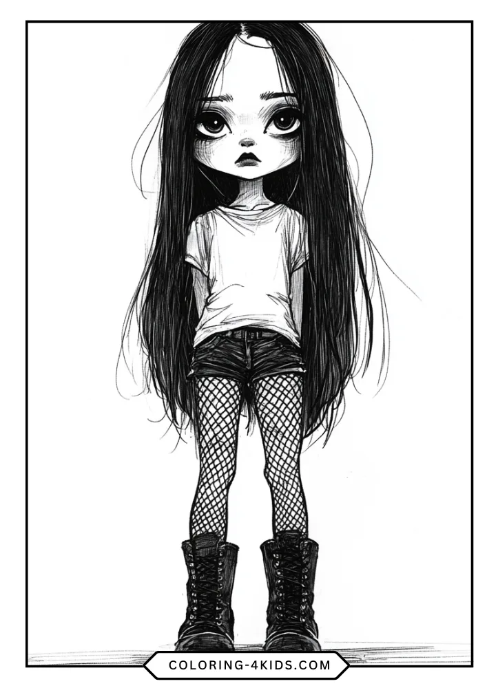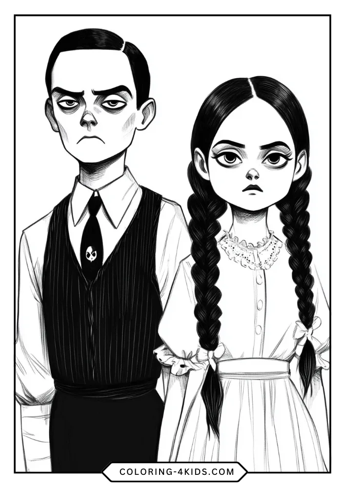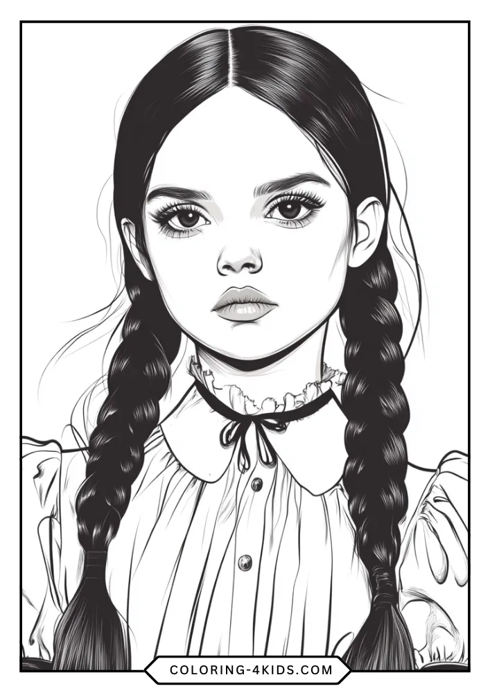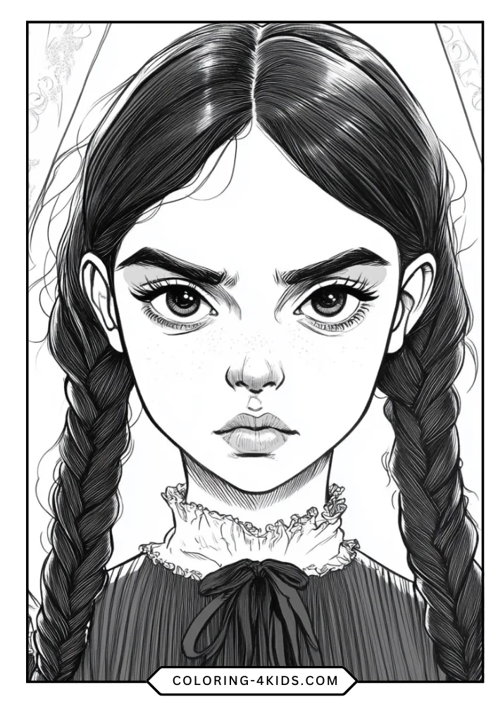 - Stylized Artistic Variations: Includes several “chibi” or doll-like versions of Wednesday that are perfect for younger children to color.